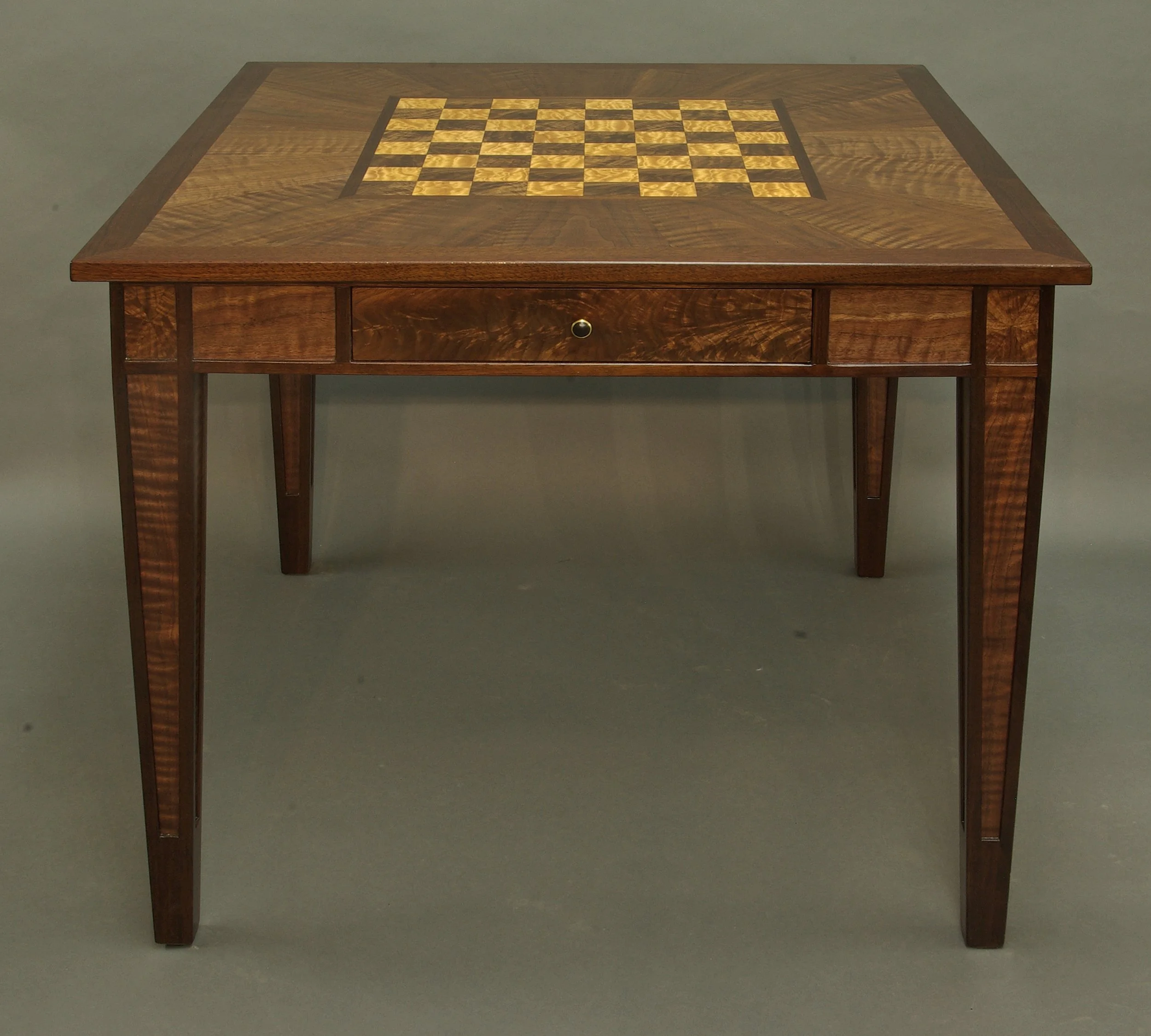 36” sq x 30 H. includes chessmen peruvian walnut, curly black walnut, walnut crotch,and quilted maple.